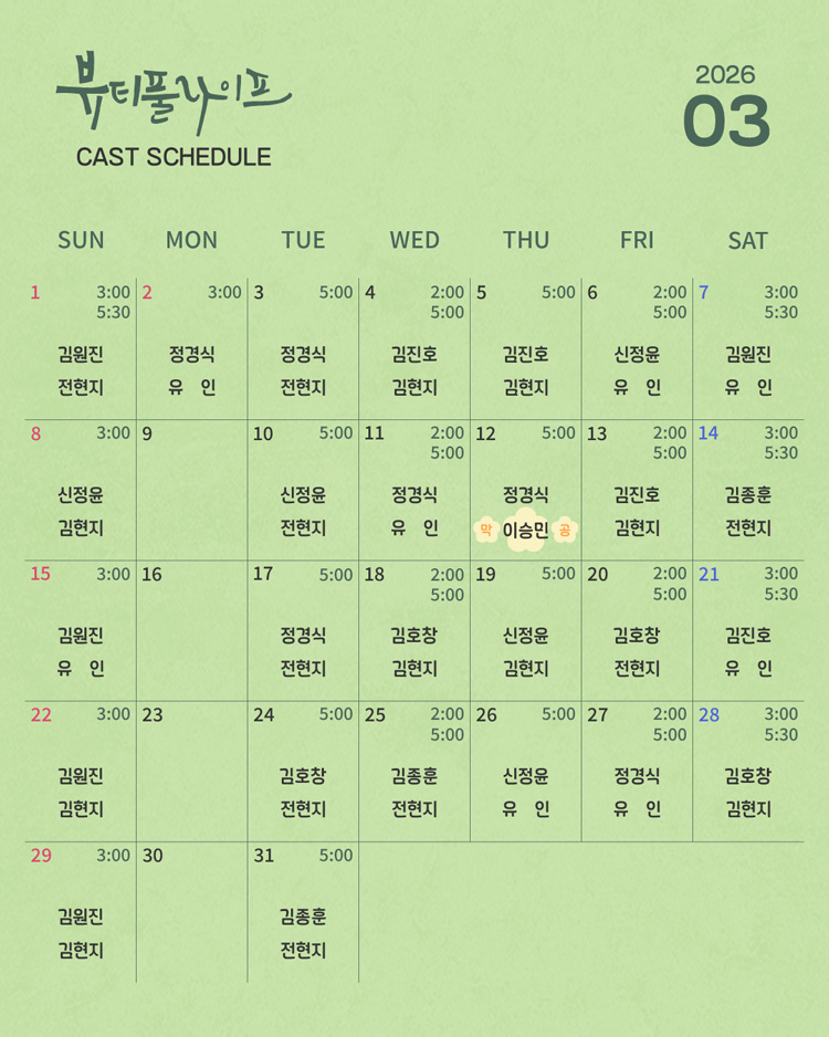 周二 17:00 / 周三 14:00、17:00 / 周四 17:00 / 周五 14:00、17:00 / 周六 15:00、17:30 / 周日 15:00